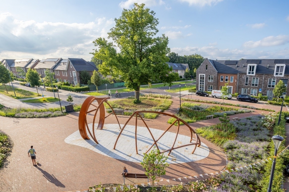 In de nieuwbouwwijk De Contreie in Oosterhout (NB) is afgelopen herfst het Vrachelsplein officieel geopend. Het centrale ontmoetingsplein brengt kunst, groen en hergebruik samen en vormt daarmee een opvallend voorbeeld van duurzaam en sociaal openbaar gebied. Blikvanger is het kunstwerk Dolium, een 4,5 meter hoge en 12 meter lange cortenstalen kruik die met een 3D-printer is vervaardigd.