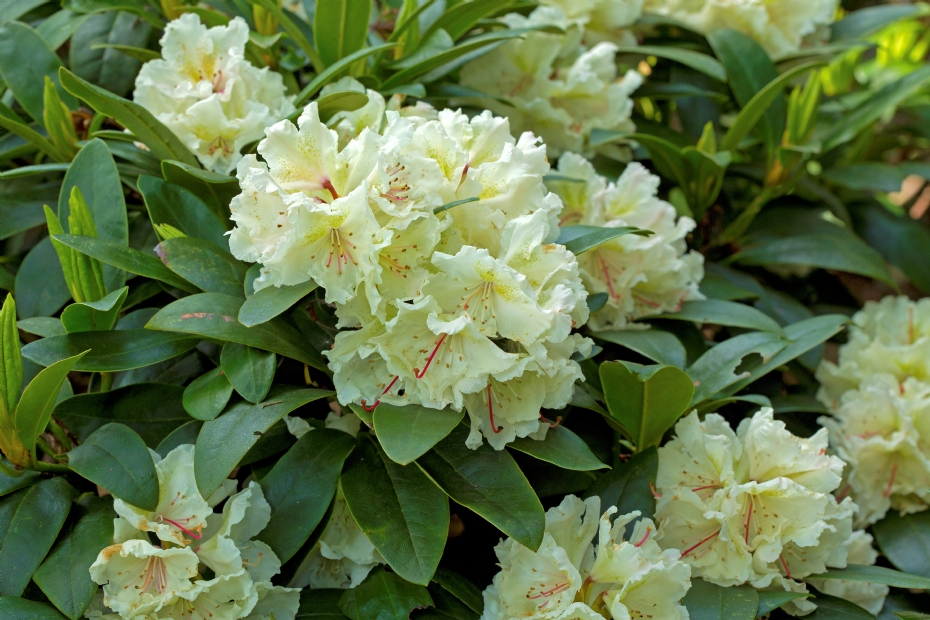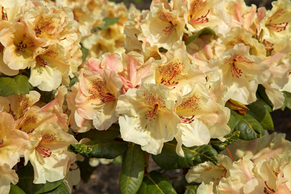 Ongeschubde wilde soortenEr worden ruim 1.000 natuurlijke soorten Rhododendron onderscheiden. Veruit de meeste hiervan komen voor in Oost-Azië en de Himalaya, maar ook elders in Azië, Europa, Noord-Amerika en Australië komen rododendrons voor. Afgezien van de groepen Japanse azalea en bladverliezende azalea is een deel van de soorten niet winterhard en voor ons dus niet van belang. Maar dan nog blijft er een behoorlijk aantal soorten over, waarvan een deel geel bloeit. Uit de ongeschubde geelbloeiende soorten Rhododendron caucasicum, R. campylocarpum en R. wardii zijn de meeste cultivars en hybriden ontstaan. R. wardii is genoemd naar de Engelse planthunter Frank Kingdon-Ward (1885-1958), die veel planten vanuit Zuidoost-China en de Himalaya in het westen introduceerde. Deze soort komt voor in Tibet en de aangrenzende Chinese provincie Yunnan. Het is een forse struik, die gemakkelijk enkele meters hoog en breed kan worden. De bladeren zijn breed ovaal en iets glanzend middengroen. De bloemen zijn citroengeel tot diepgeel, vaak met een kleine rode vlek in het hart. Deze vlek wordt 'macule' genoemd, een term die veel gebruikt wordt als het om bloemen van rododendrons gaat. R. campylocarpum blijft iets lager dan R. wardii en heeft een iets westelijker verspreidingsgebied in de Himalaya. De bloemen zijn bleekgeel tot heldergeel.Zoals de naam al verraadt, komt R. caucasicum van nature voor in de Kaukasus. Het is een dichte, lage en brede plant die ongeveer 1 m hoog wordt. De bloemen, die crèmekleurig en bleekgeel zijn, openen in april en mei. R. caucasicum is veel gebruikt in kruisingsprogramma's, vaak niet met het doel om geelbloeiende cultivars te ontwikkelen, maar vanwege de groeiwijze en de uitstekende winterhardheid. De cultivar 'Luteum' bloeit met gelere bloemen. Natuurlijk zijn er diverse andere geelbloeiende soorten in deze groep, maar die zijn onvoldoende winterhard in Nederland en België of ze worden niet gekweekt.