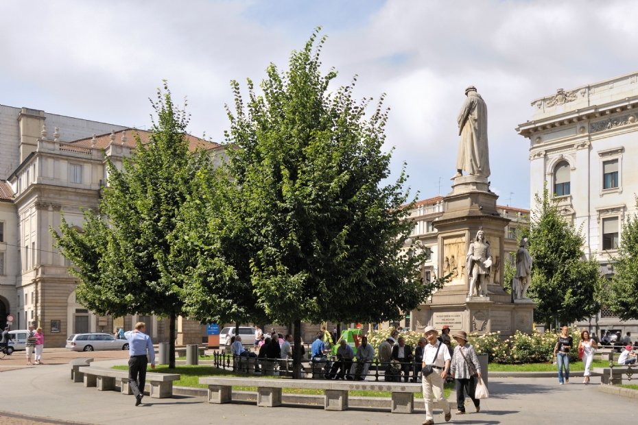| Mensen zoeken het beetje schaduw op dat er is. Beeld ter illustratie: Italië, Mailand, Piazza della Scala |