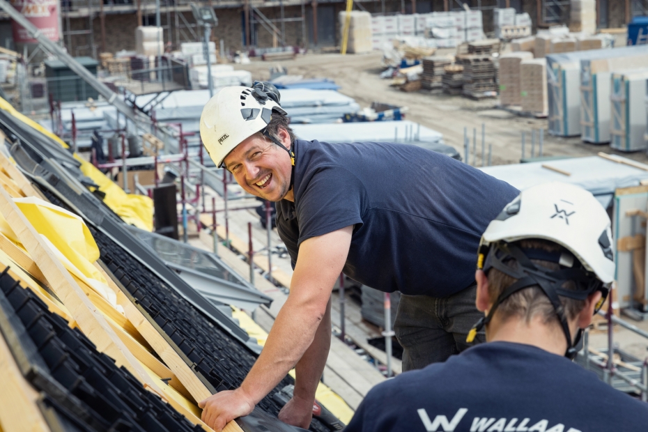 Kwam men tijdens de bouw nog onverwachte zaken tegen? Van der Knaap: ‘We hebben wel wat moeite om bouwstroom te verkrijgen en hebben daarom een duurzame bouwplaats ingericht. Een gigantische accu, windturbines en zonnepanelen voorzien het project nu van bouwstroom. Zo ontstond meteen een bouwplaats van de toekomst.’ Castelijn: ‘Ook Wallaard draagt bij aan de duurzame inrichting van de bouwplaats. Zo zijn al onze bouwcontainers standaard voorzien van een groendak.’