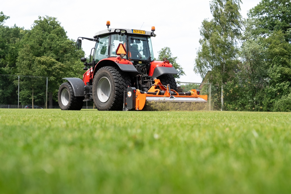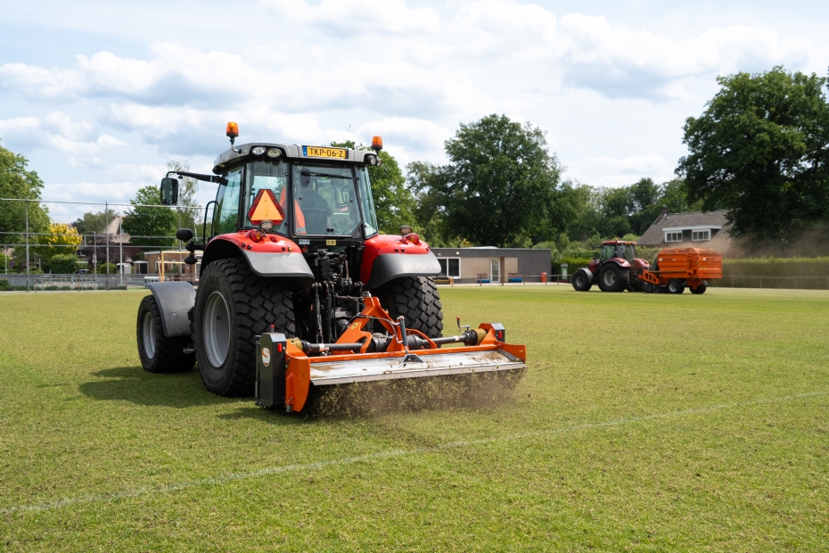 Hoe zuinig en onderhoudsvriendelijk zijn de machines? Van den Hardenberg: ‘De messen zijn van hard metaal. Ze staan zo opgesteld dat het ene mes uit de grond is voor het volgende mes de grond insnijdt. Hierdoor wordt schade aan de grasmat voorkomen. Ze draaien mee met de rijrichting. Daardoor is er minder kracht nodig en gebruikt de machine minder brandstof. Het frame van de machines is robuust gebouwd en heeft aan beide kanten een V-riemaandrijving, die weinig onderhoud nodig heeft. Verder zitten de stelpoten onder de machine, zodat je de machine na gebruik veilig kunt neerzetten zonder de messen te beschadigen. Het onderhoud is eenvoudig: alleen de lagers en de aftakas moeten gesmeerd worden, en dat kan op een goed bereikbare plek.’