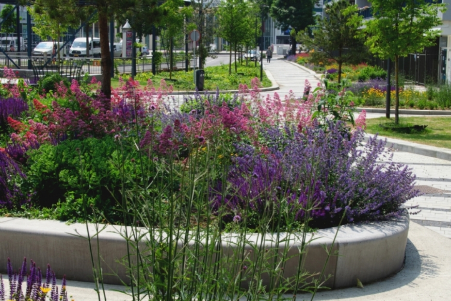 | | plantvakken met parkbanden en kleurrijke beplanting |