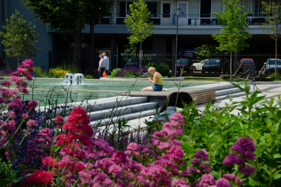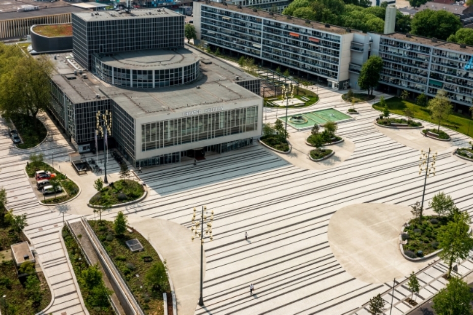 Het ontwerp houdt rekening met bestaande verkeersroutes, zichtlijnen en gebruik door voetgangers en fietsers. Auto’s en expeditieverkeer zijn te gast. Het plein is ingericht als entreegebied voor het theater, met ruimte voor urban sports en evenementen zoals de kermis. Onder het plein ligt een capillair irrigatiesysteem dat water buffert tijdens piekbuien en beschikbaar stelt in droge periodes, zonder inzet van pompen. Op de Promenade is een wadi aangelegd, die zowel water opvangt als bijdraagt aan biodiversiteit en verblijfskwaliteit.
