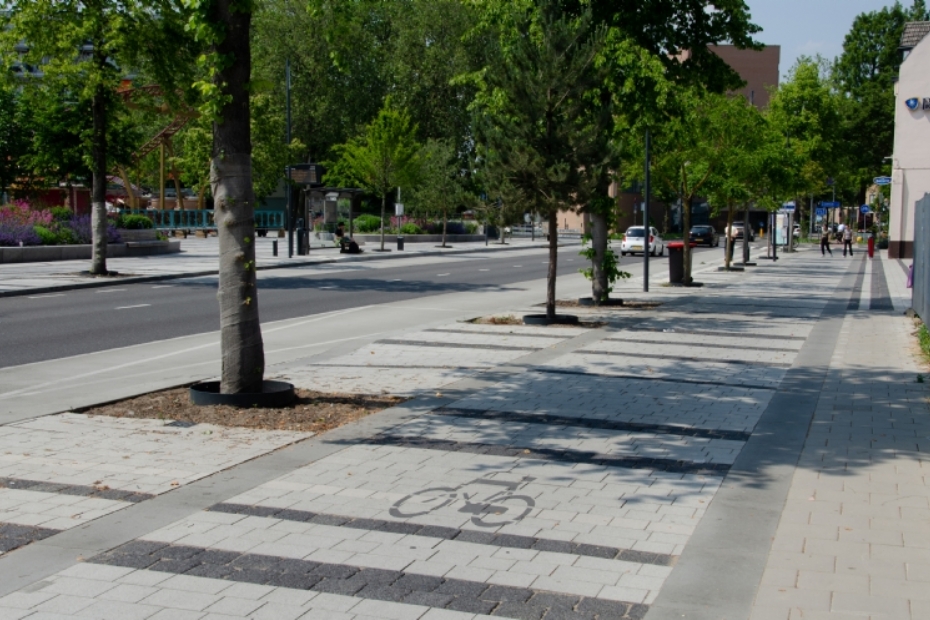| | in de verharding zijn op een subtiele manier fietspaden aangegeven |