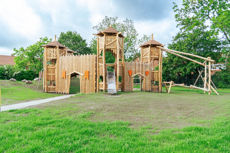 | De burcht is de eyecatcher van deze speelplek. |