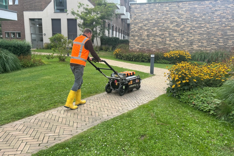 Een recente toepassing van de eWeeding Roller was in de binnentuin van wooncomplex Avenue 1895 in Arnhem. Van Viegen vertelt dat deze tuin direct op een parkeergarage ligt en via een ondergronds systeem wordt bewaterd. 'Onder de bestrating en beplanting zit een doorlatende lavalaag. Door de beperkte opbouwhoogte en de ligging boven een warme ruimte is de temperatuur in de ondergrond relatief hoog. Daardoor ontstaat een gunstig groeiklimaat - ook voor ongewenste vegetatie. Vooral grassoorten komen door de verharding heen.' Maar dat blijkt voor de eWeeding Roller geen probleem. Die is ook hier effectief in het beheersen van de groei, zonder aanpassing van de machine of belasting van de ondergrond.