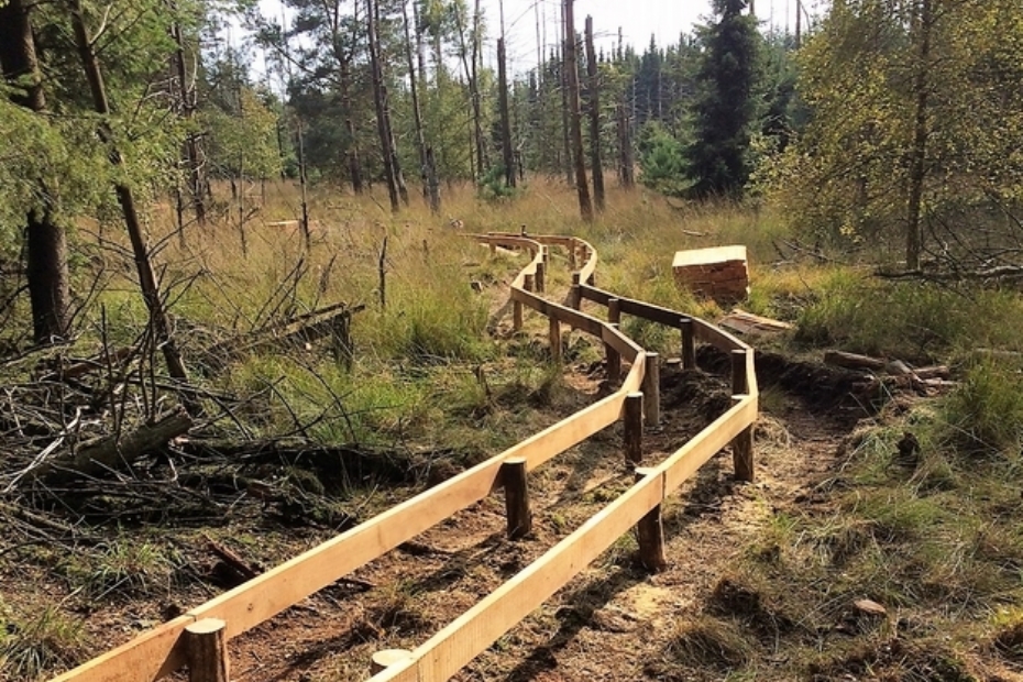Het plankenpad volgt de beschikbare ruimte in de natuur. Er worden geen bomen omgezaagd, het pad kronkelt er juist tussendoor. De onderconstructie van het pad is gemaakt van duurzaam Europees Eiken en Robinia. Voor het loopdek is gebruik gemaakt van Douglas planken, afkomstig van Douglas bomen uit de Stippelberg zelf. Over circulair en duurzaam gesproken!