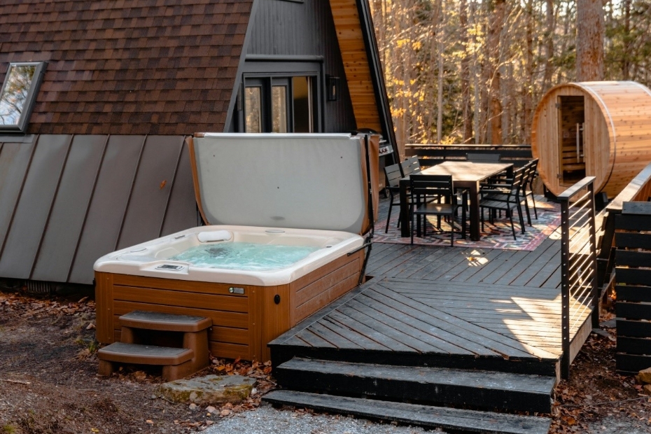 Een terrasoverkapping of afdakje boven je jacuzzi verlengt het buitenseizoen aanzienlijk. Je zit beschut tegen regen of wind, terwijl je nog steeds geniet van het buitengevoel. Voor nog meer comfort kun je zelfs een gesloten tuinkamer creƫren met glazen schuifwanden. Een comfortabele bank, een wollen plaid en een kop warme chocolademelk maken het plaatje compleet.