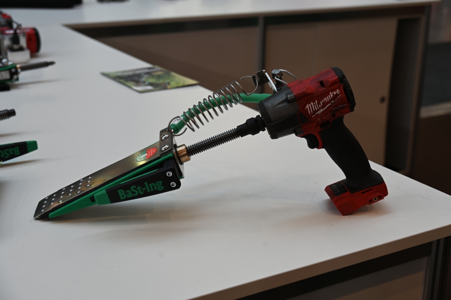 Bast-ING toonde een elektrische spie voor boomvelling op een accuboor. De spie wordt in de zaagsnede geplaatst en duwt een boom gecontroleerd om. Het product bestaat al langer maar is in Nederland weinig bekend. Voor beheerders die veel handwerk verrichten kan zo'n elektrische spie een alternatief zijn voor hand- of hydraulische wiggen. Het bedrijf demonstreerde daarnaast compacte hulpmiddelen voor kettingzaagonderhoud, waaronder apparaten om kettingzagen snel te slijpen.