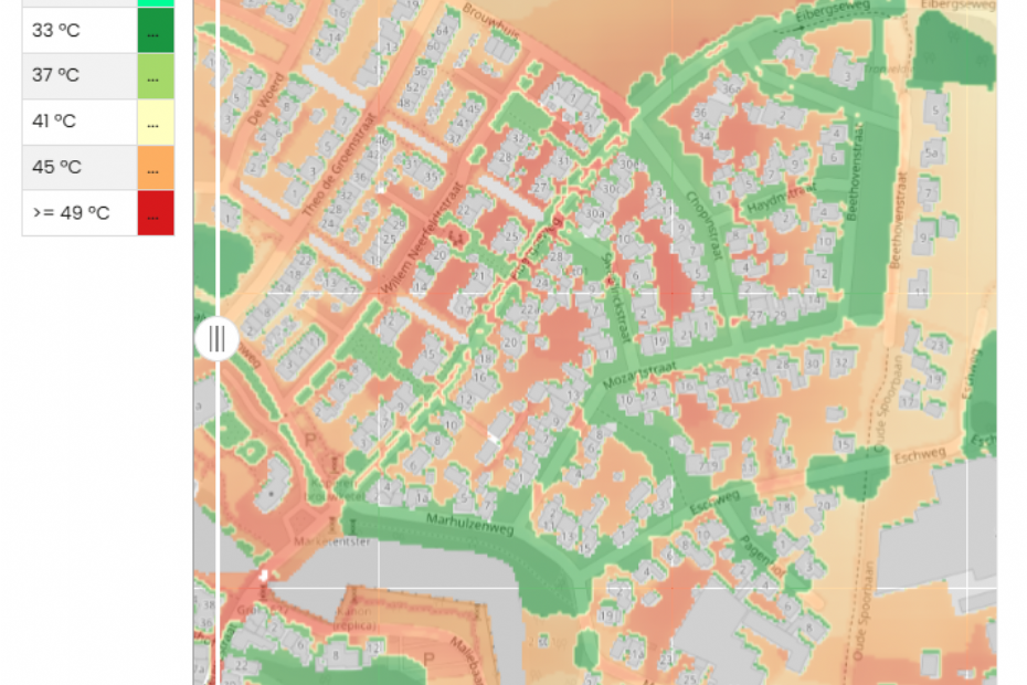 | | Een overzicht van de huidige situatie over 50 jaar, van de gevoelstemperatuur in de wijk Oosteres. |