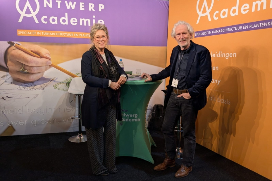 Patricia van Baar en Dolf Houtman van de OntwerpAcademie brengen onder meer de vakopleiding Tuinontwerper eerste leerjaar en Natuurinclusief Ontwerper Buitenruimtes tweede leerjaar onder de aandacht. Voor laatstgenoemde opleiding - die 28 januari begint - is nog plek. Aan interesse geen gebrek bij de stand. 'Ik ben schor van alle gesprekken', grapt Patricia. 'Ik merk dat er veel interesse in onze opleidingen is. Veel Hoveniers willen meer weten over het ontwerpvak. Jongeren zijn heel geïnteresseerd in het bijspijkeren van hun plantenkennis. Sindskort hebben we ook een leslocatie in Noordschut. Op die plek leiden we mensen tot planten adviseur op.'