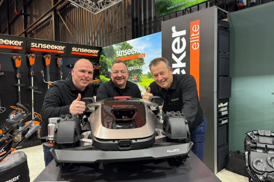 Ralf Doldersum, Jeroen Knopert, Anton Kocken (v.l.n.r.) poseren achter de 4WD vlaggenschip robotmaaier van Sunseeker, de X9 . Knopert is sinds vorig jaar importeur van Sunseeker Robotics en verkopen naast robot van dit Chinese merk ook andere accutools van Sunseeker.