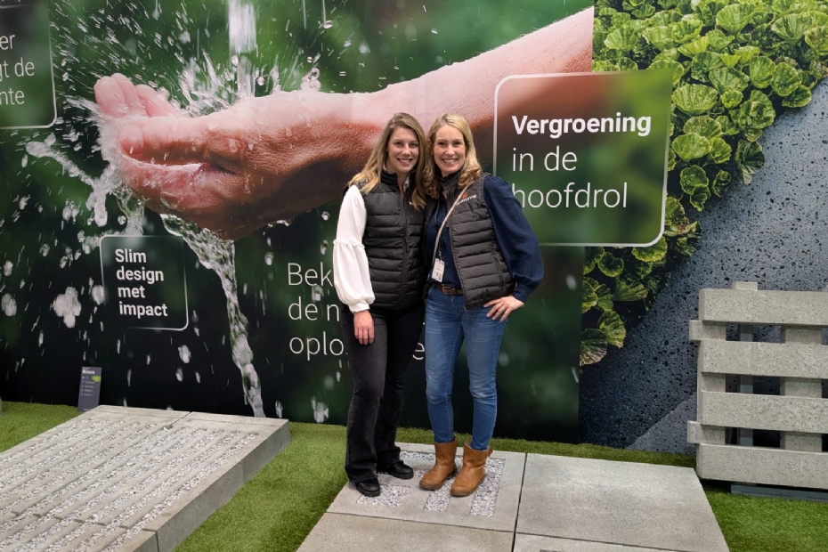 Chantal Geerdink en Chantal van Pelt van Schellevis tonen de nieuwste lijn grasbetontegels op de beurs. Deze productlijn heeft speciale inkepingen waar bijvoorbeeld gras of grind in verwerkt kan worden. De inkepingen hebben dezelfde vorm als het logo van Schellevis. 'We bieden het Legopakket voor de tuin', zegt Geerdink. 'Er valt veel te kiezen en er zijn allerlei combinaties mogelijk. De eerste beursdag was een succes te noemen. Het was erg druk op de stand en we hebben veel goede gesprekken gehad '