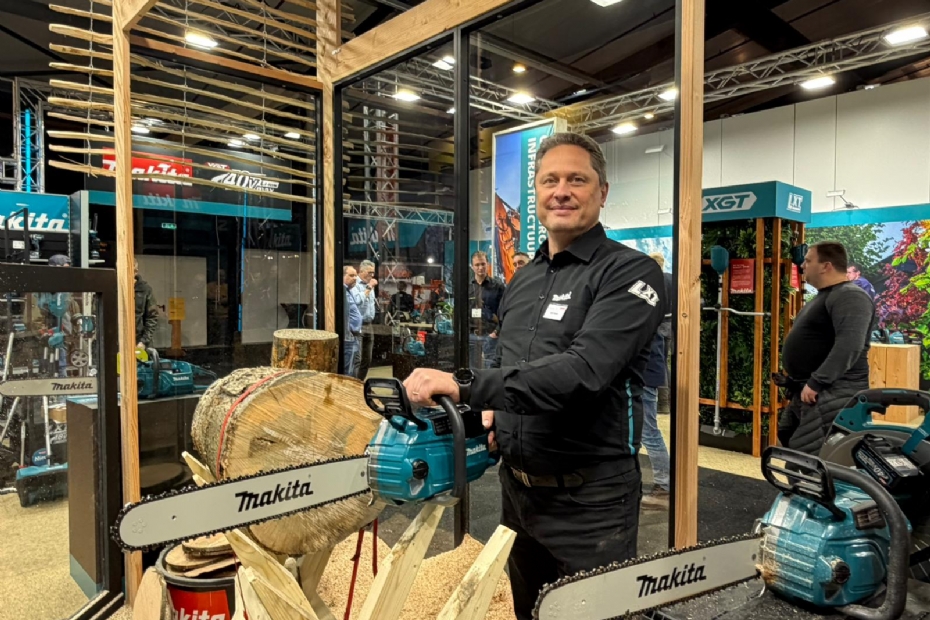 Arjen Peeters van Makita met de nieuwe UC030 kettingzaag. De UC030 werkt op 40V met een vermogen dat nagenoeg vergelijkbaar is met een 60 cc benzine zaag. Andere noviteiten op de stand zijn bijvoorbeeld een rotatielaser op een 40V schrobmachine.
