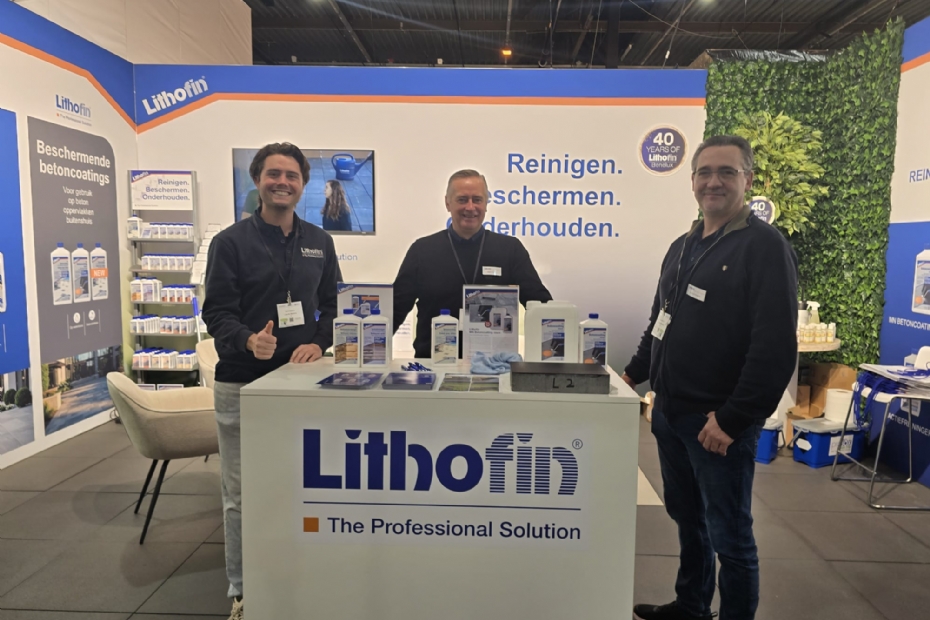 Maxim Horemans en Mario Franken en Sascha Klusener van Lithofin. Eerste keer op de vakbeurs. Werken in Nederland samen met Kijlstra, MBI De Steenmeesters en Romfix. Vierden onlangs het veertig jarig jubileum in België en 70 jarige in Duitsland. Nu is Nederland aan de beurt.