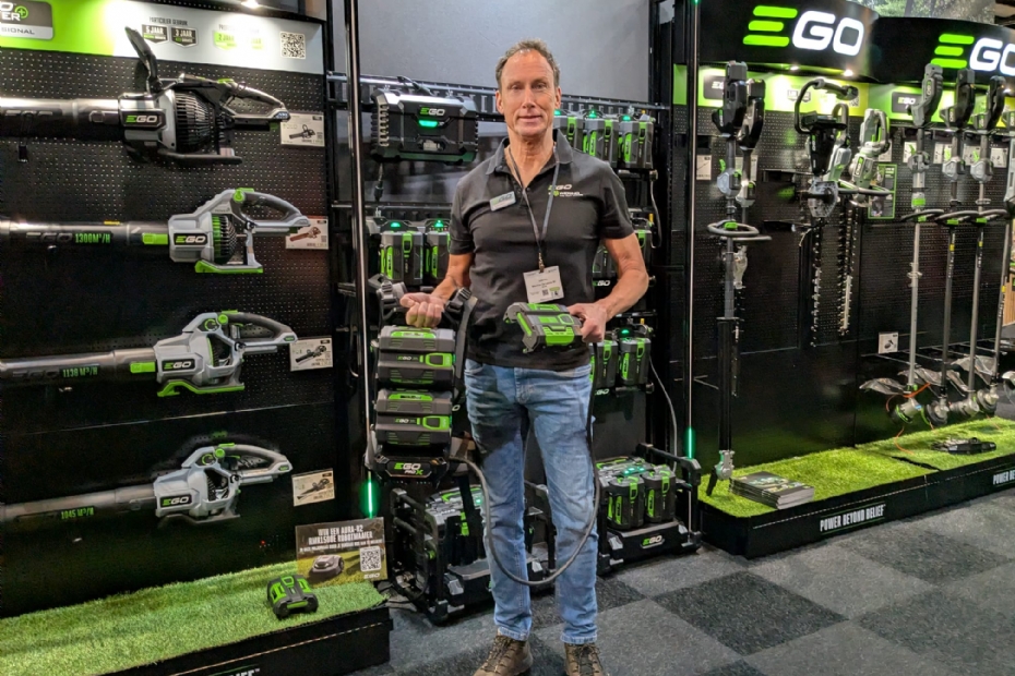 Het team van EGO pakt uit met een flink aantal nieuwe producten. Andre Kors: 'We hebben behoorlijk wat primeurs te delen op de beurs. Denk bijvoorbeeld aan een nieuwe loopmaaier met epoxydek. Ook pakken we uit met een nieuwe kettingzaag en een nieuw model heggenschaar en een extreem lichte trimmer. Nieuw is ook een single blade heggenschaar met kam. Onze stand wordt goed bezocht en over aandacht hebben we dan ook niet te klagen.'