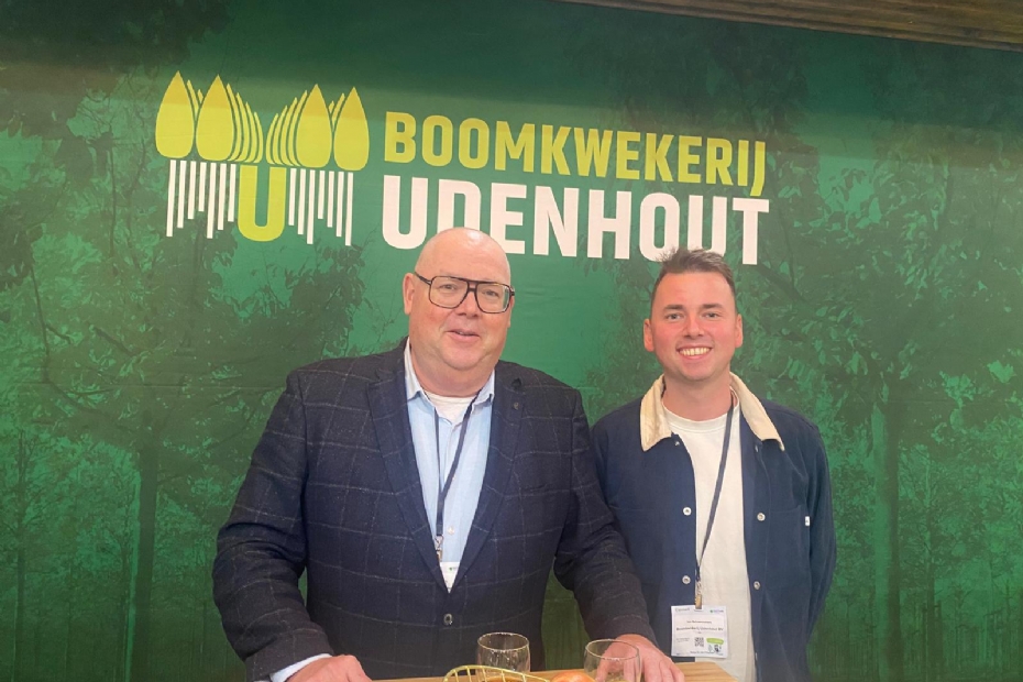 Corné Leenders en Tom Schoenmaker van Boomkwekerij Udenhout hebben een duidelijk doel deze drie dagen: relatiebeheer. Dit viel de eerste dag tegen, vertelt Leenders: 'Het was gisteren wel heel druk, maar kwalitatief hebben we niet veel goede gesprekken gehad. In uur een tijd vandaag hebben we al waardevollere gesprekken gehad dan gisteren.'