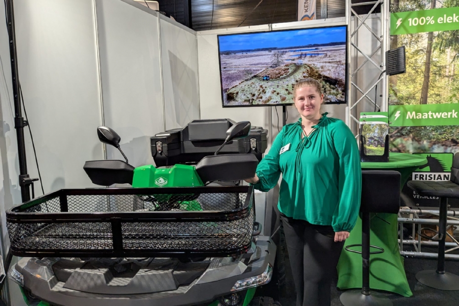 Thessa Blaauwbroek van Frisian Motors staat in Hardenberg voor relatiebeheer: 'We komen hier veel van onze klanten tegen en dat is prettig. Daarnaast laten we op de beurs onze Volmer Quad FM240 zien en kunnen bezoekers onze FN80 Cargo in het echt zien. Het gaat hier om het ideale voertuig voor groenbeheerders en gemeenten. Uiteraard volledig elektrisch.'