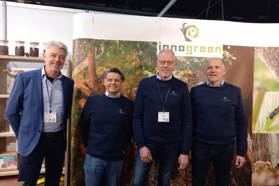 Innogreen is er met een grote groep medewerkers. V.l.n.r. Ruud Snijders, Boudewijn Zandee, Johan Schotanus en Peter Meerwijk. 'Voor ons is dit echt een relatiebeurs; we willen geen producten verkopen en nemen die dus ook niet mee. We willen eerder een beleving in de tuin van de hovenier meegeven. Wat kan die bereiken door organische materialen te gebruiken? We leveren organische meststoffen bodemverbeteraars, maar ook kennis. Die kennisdeling in de vorm van onder andere lezingen, willen we binnen vijf jaar verdubbeld hebben. Daarom is Johan Schotanus het team komen versterken. Ook willen we die kennis concreet inzichtelijk maken. Dus: gebruik je onze producten, dan voeg je geen zouten toe aan de bodem. We willen laten zien hoevéél zouten je dan precies bespaard hebt. Dat wordt ook een doelstelling op zich. We zitten echt in een groeispurt. We zijn weliswaar smal binnen de gehele groene sector, maar we zijn extreem breed gespecialiseerd.'