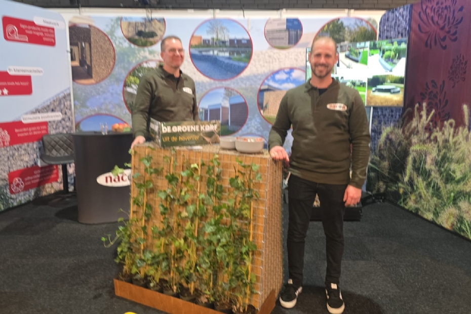 Gijsbert Hendriks van Warbij en Dennis van Houwelingen van Nacon met de groene schanskorf, waar erg veel belangstelling voor is, door de unieke toepassing en mogelijkheden voor hoveniers. Minder afvoer uit de tuin is immers super meegenomen!