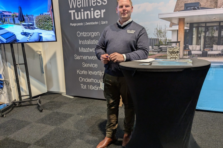 Dirk Jan Huttinga van Wellness Tuinier heeft een goede beurs: 'Het is lekker druk op de stand. We hebben veel ruimte over gelaten voor onze nieuwe trapindeling met een natuurstenen plage. Dat zorgt voor een meer natuurlijke uitstraling. Ook pakken we uit met onze waterbesparende fillertechniek waarmee je op jaarbasis wel 6000 liter water bespaart.'