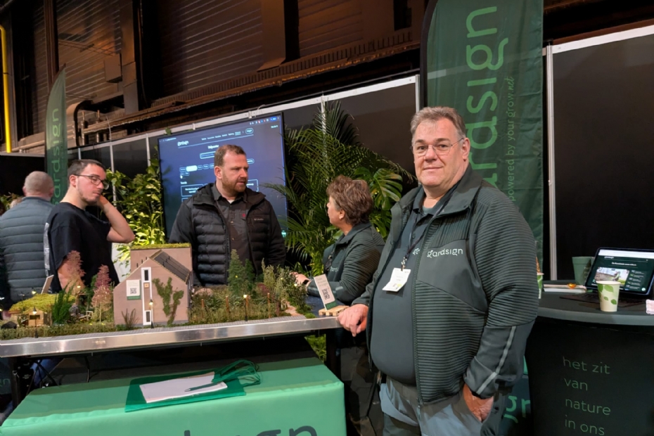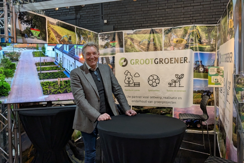 Bij Groot Groener zien we Andre Trip. Maakt zich op voor de laatste beursdag, heeft tot nu toe een goede beurs. Groot Groener is partner voor ontwerp, realisatie en onderhoud van groenprojecten.