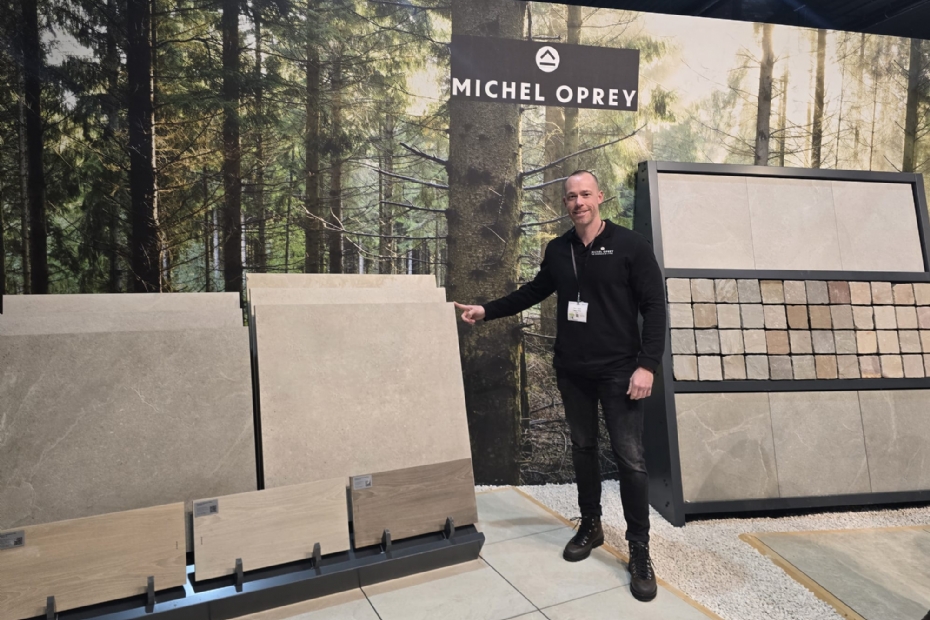Gideon Luitwieler van Michel Oprey introduceert de nieuwe keramische tegels van een meter bij een meter ( ook in 60 en 90) in samenwerking met Art of Living. Daarnaast is nieuw de Earth serie, verkrijgbaar in 60x60 en 90x90. Beide formaten zijn er in twee en drie cm dikte.