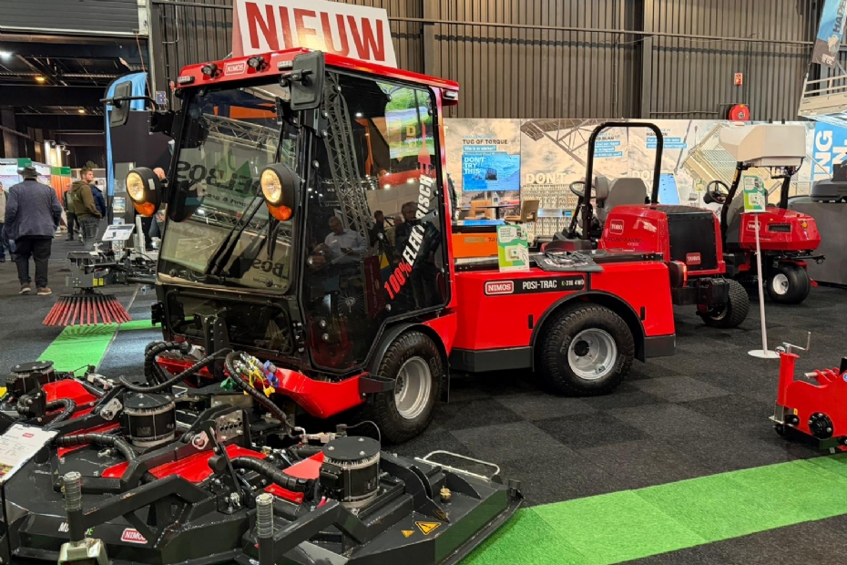 Nieuwe Nimos Posi-Trac K-316 4WD op de stand van Heybroek, een volledig electrische werktuigdrager. Hier uitgerust met 3-delige frontmaaier met een werkbreedte van 3 mtr. Aandrijving van de messen en wielen is electrisch. Heffen van de maaier en sturen is hydraulisch. Er is voor gekozen om de aandrijving via een V-snaar te regelen. Dat lijkt ouderwets maar is nog steeds de meest veilige oplossing.