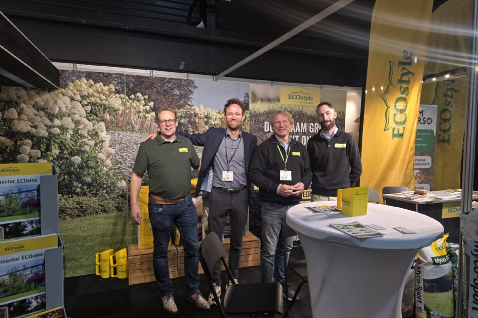 Gerwin te Velde, Joop Damhuis, Hans Eildert van der Wijk en Martijn Arends van ECOstyle Professional; 'vandaag is het een topdag, het record boksen naar de betere bodem is gebroken!' Organische bioafbreekbare bodembedekkers zijn nieuw is assortiment.