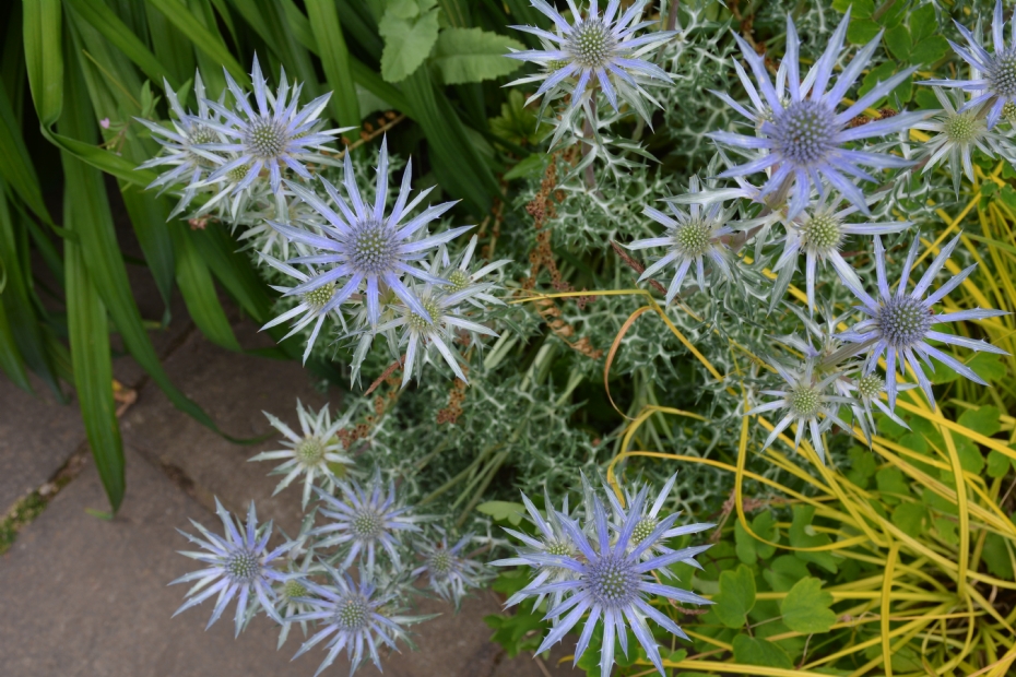 Blauwere bloei en frisser, zilvergeaderd blad dan Eryngium maritimum (blauwe zeedistel). Sterk op droge, schrale gronden en goed bestand tegen zon en wind.