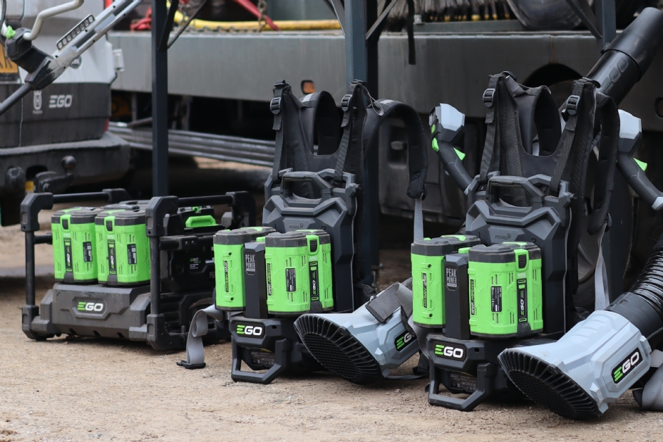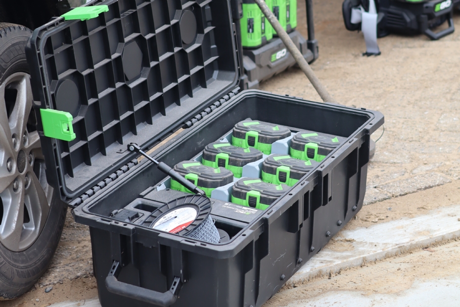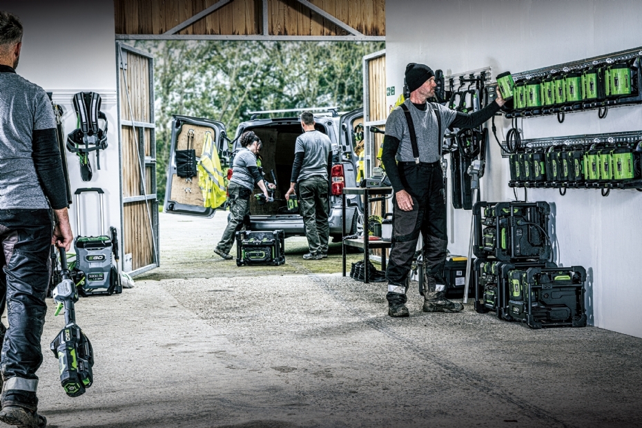 Samen met leverancier en EGO-dealer Mark Steenbeek van de firma Bassa in Lunteren berekende Van Lagen hoeveel capaciteit nodig is voor een volledige werkdag. Voor een vierkoppige ploeg komt dat neer op achttien accu's per dag, plus een accupak voor tussentijds laden. Na het werk gaan alle accu's in afsluitbare laadkoffers of in het PGX-laadsysteem, waar ook de powerbank met 40Ah-accu op kan worden aangesloten.