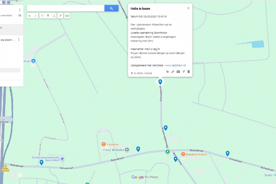 Rapportages kunnen worden gedeeld met derden, zoals een opdrachtgever of gemeente, en zijn exporteerbaar naar GIS-systemen als ArcGIS en Fieldmaps. 'Via een kml-bestand kun je de waarnemingen als puntjes inprikken op een andere kaart,' legt Krijger uit. 'Voor bedrijven die al met GIS werken, is dat heel waardevol.'