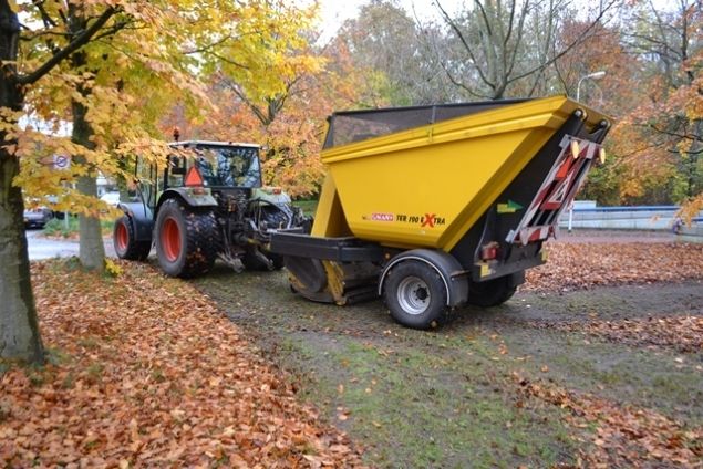 Hier onder ziet u de getrokken Ter 190 extra van Omarv, een klepelmaaier/zuigcombinatie, die nu geen gras maait, maar 'blad hapt' en verzamelt.
