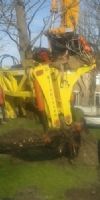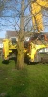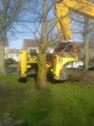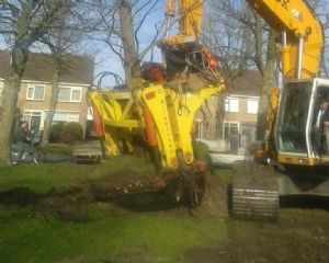Verplantmachine gebruikt bij verplaatsen bomen in Stiens |