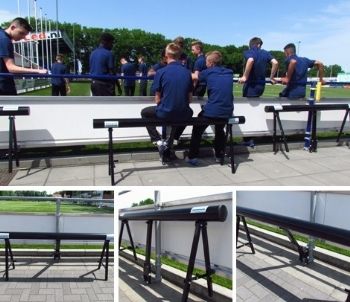 ‘Het idee van een zitbank langs de lijn, achter de reclameborden, is natuurlijk niet nieuw,’ weet ook Oude Luttikhuis, ‘maar deze bankjes zijn inklapbaar. Dat is erg handig als je het terrein schoon wilt maken. Dan kun je er gemakkelijk bij. Daarnaast hebben de bankjes een ronde bovenkant. Er blijft geen regen op staan en het is ergonomisch verantwoord. Een fysiotherapeut vertelde me dat je met deze bankjes direct een juiste houding aanneemt bij het zitten. Met een rechte rug. De banken zijn bovendien licht van gewicht, makkelijk schoon te maken en overal te monteren. Het concept heeft ons al veel enthousiaste reacties opgeleverd en zal de komende tijd in de rest van het land worden geïntroduceerd.’