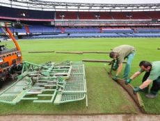 Medewerkers van Hendriks Graszoden uit Heythuysen (NB) leggen samen met Erwin Beltman, teamleider veldonderhoud van Feyenoord, een nieuwe grasmat in De Kuip.