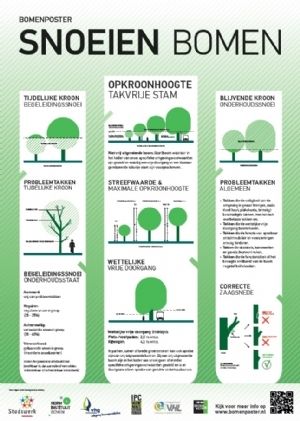 De bomenposter omvat belangrijke aandachtspunten in het kader van snoeiwerkzaamheden voor 'niet vrij uitgroeiende' bomen. Onderwerpen die aan de orde komen zijn; tijdelijke en blijvende kroon, opkroonhoogte en takvrije stam, onderhoudsstaat en probleemtakken. Uiteraard komt ook de uitvoering van een correcte zaagsnede aan de orde.