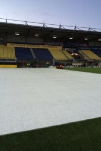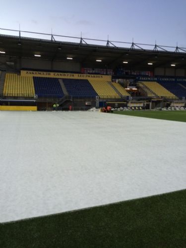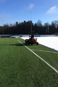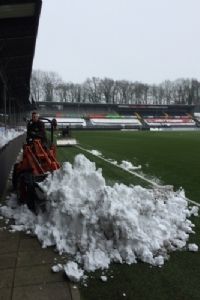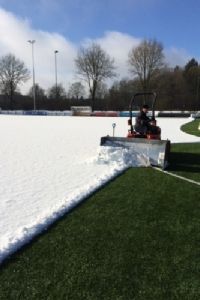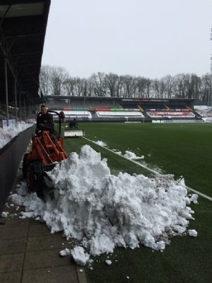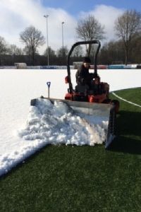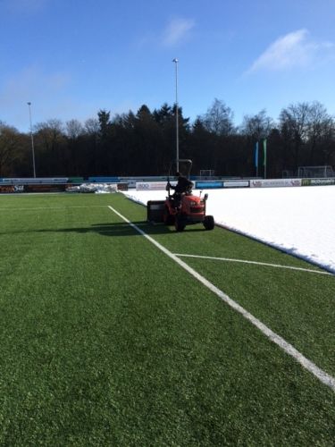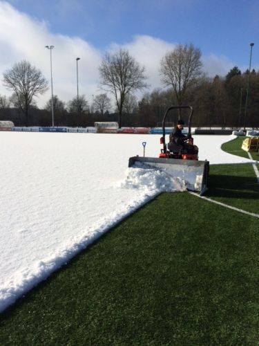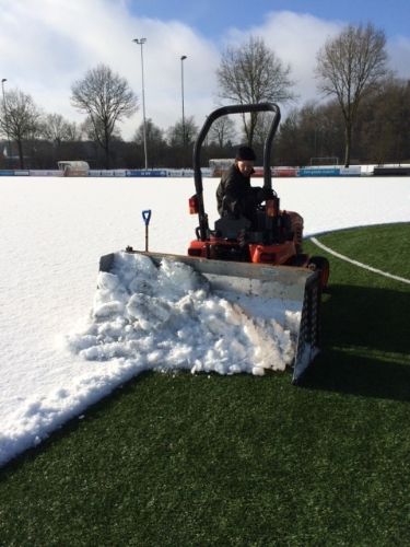 Vanuit de ervaring in de praktijk heeft Rolugro een sneeuwschuiver voor kunstgras ontworpen. Deze sneeuwschuiver wordt deze dagen volop gebruikt. De resultaten zijn goed, het hele veld is binnen de kortste keren sneeuwvrij en de verplaatsing van rubber is daarbij gering. Nadat het veld sneeuwvrij is gemaakt, wordt het veld gesleept om te zorgen dat het rubber weer goed verdeeld wordt. Naast dat het complete kunstgrasveld voor wedstrijden (1e en eredivisie) vrij moet zijn van het sneeuw, bestaat er ook de mogelijkheid om de sneeuw in de uitloopstrook te schuiven. Er blijft dan voldoende ruimte over om te kunnen trainen.