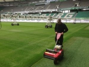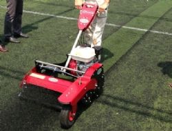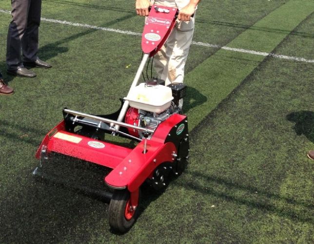 Het hulpstuk PT25 is een tegen-de-richting-in draaiende borstel. Deze borstel veegt de oppervlakkige vervuiling op en werpt het in de opvangbak. Het hulpstuk PT26 bestaat uit messen die onder een hoek op de hoofdas gemonteerd zijn. Tussen deze messen zijn twee borstels gemonteerd. Door het feit dat de messen schuin gemonteerd zijn, werken deze het vuil los diep tussen de vezels van het kunstgras. Het losse vuil wordt vervolgens door de twee borstels in de opvangbak geworpen. Dit is een effectieve methode voor de diepere vervuiling. Het hulpstuk PT27 bestaat uit een reeks kleine harkjes die ook op de hoofdas gemonteerd zijn. Ook deze hoofdas draait tegen de rijrichting in en werpt het vuil in de opvangbak. Door het feit dat het steunwiel en aandrijving van de basismachine aan de linkerkant zitten, kan men aan de rechterzijde dicht langs een hekwerk, muur of afrastering werken. Vaak zit op deze plekken de meeste vervuiling omdat deze plaatsen moeilijk te bereiken zijn met grote reinigingsmachines en deze plaatsen minder bespeeld worden. Ook is op deze manier de overgang tussen een natuurgras-sportveld naar een kunstgras-uitloopmat zeer goed bij te houden. Ook voor kleine kunstgras speelveldjes is de machine uitermate geschikt. De PuT is maar 75cm breed en is daarom prima door smalle hekjes te manoeuvreren De PT 60 Powerunit wordt standaard geleverd met een 5 pk Honda motor die de achterwielen en de twee PTO (Power Take Off) aandrijfassen via onafhankelijke koppelingen aandrijft. De rijsnelheid kan worden ingesteld door het wisselen van tandwielen. Er zijn vier snelheden mogelijk van 1,8 km/u tot 2,6 km/u. De PT 60 kan eenvoudig worden vergrendeld in de transportstand. Dit maakt het vervoer van de machine met cassettes eenvoudig. De transportvergrendeling wordt ontgrendeld door de knop van de PTO inschakeling te bedienen. De PT60 Powerunit is standaard uitgerust met twee PTO aandrijfassen, die 1000 en 3000 toeren draaien. Elke individuele PT cassette is zo ontworpen dat na het aankoppelen van het hulpstuk deze altijd het juiste toerental draait. Meer informatie is te vinden op onze website: www.maredo-bv.com/nl