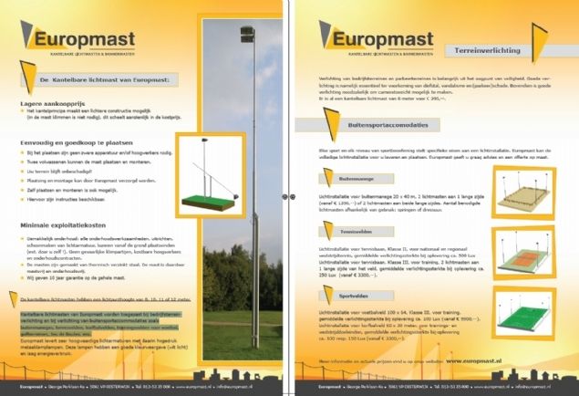Kantelbare lichtmasten van Europmast worden toegepast bij bedrijfsterreinverlichting en bij verlichting van buitensportaccommodaties zoals buitenmaneges, tennisvelden, korfbalvelden, trainingsvelden voor voetbal, golfterreinen, Jeu de Boules, enz.